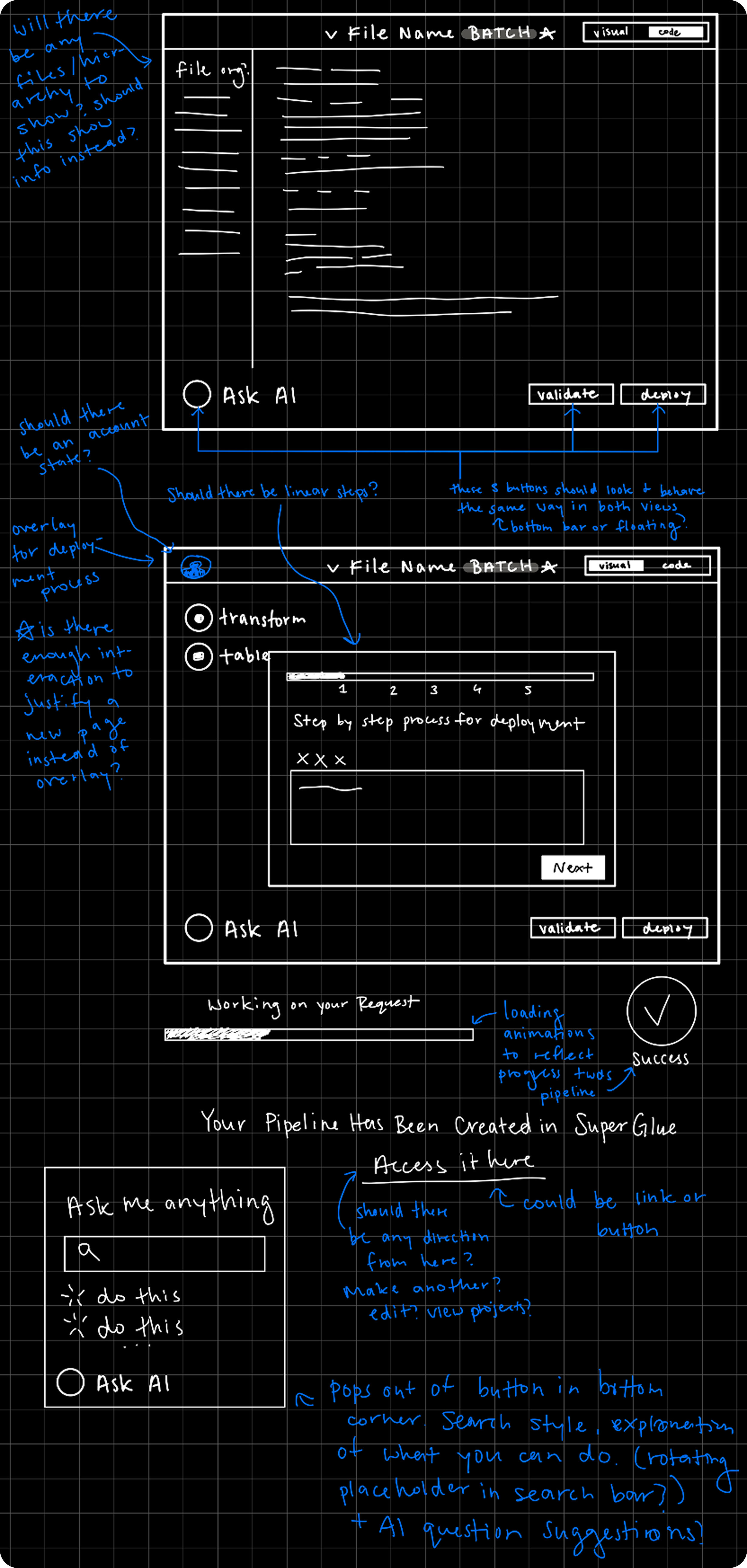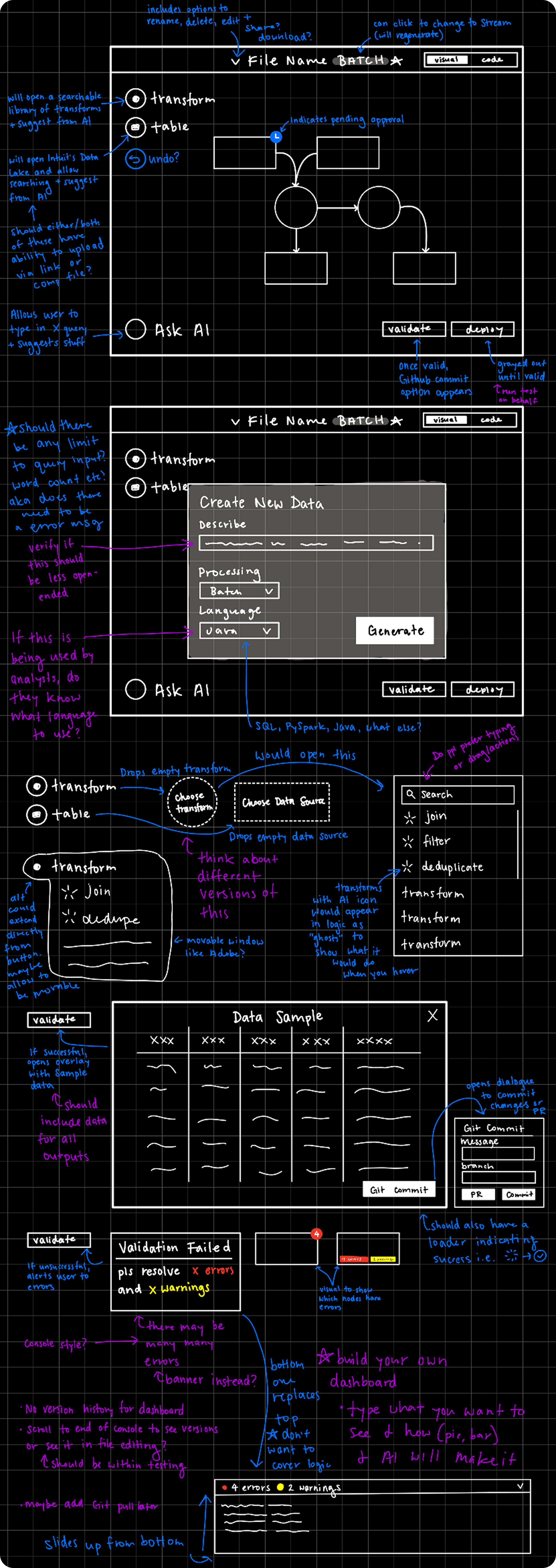 Following our established objectives, I began the design process with initial sketches that mapped out the conceptual flow of Datascape's pipeline creation experience, focusing on the logical progression between stages and how users would navigate from natural language inputs through to finalized, testable code.